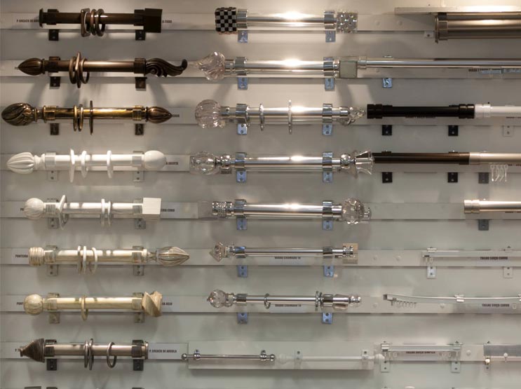 A RD trabalha com os mais diversificados acessórios para composição estética de cortinas e persianas. Trilhos tradicionais de alumínio, trilhos suíços, varões de madeira e metal, suportes simples, duplos e triplos, ponteiras simples e trabalhadas. Tudo para personalizar seu ambiente.